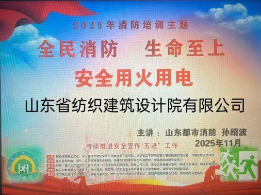 為積極響應2025年全國"消防宣傳月"活動號召,11月14日,山東省紡織建筑設計院有限公司在漢峪金谷A2-5棟辦公區開展以"全民消防、生命至上——安全用火用電"為主題的消防系列活動。